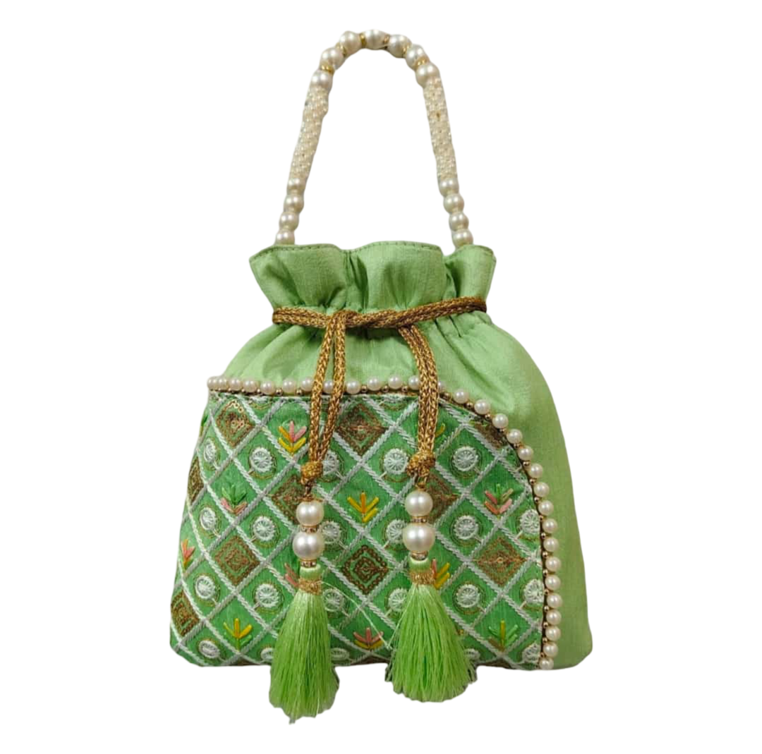 Perfect for brides and festive occasions, this embroidered potli bag is made of raw silk fabric with a strong matching lining. Heavy embroidery and a pearl handle give it a royal touch, while tassels enhance its beauty. Lightweight yet spacious, it carries essentials like mobile phones, cash, and cards with ease. This potli bag completes your ethnic attire, making it a fashionable and functional choice for weddings, receptions, and festive parties.